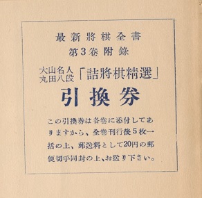 本書は『最新將棋全書』全5巻の奥付に添付の「引換券」5枚と郵送料20円切手で引き換えられた。